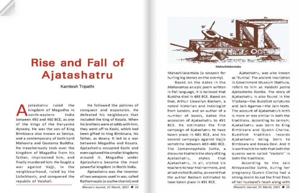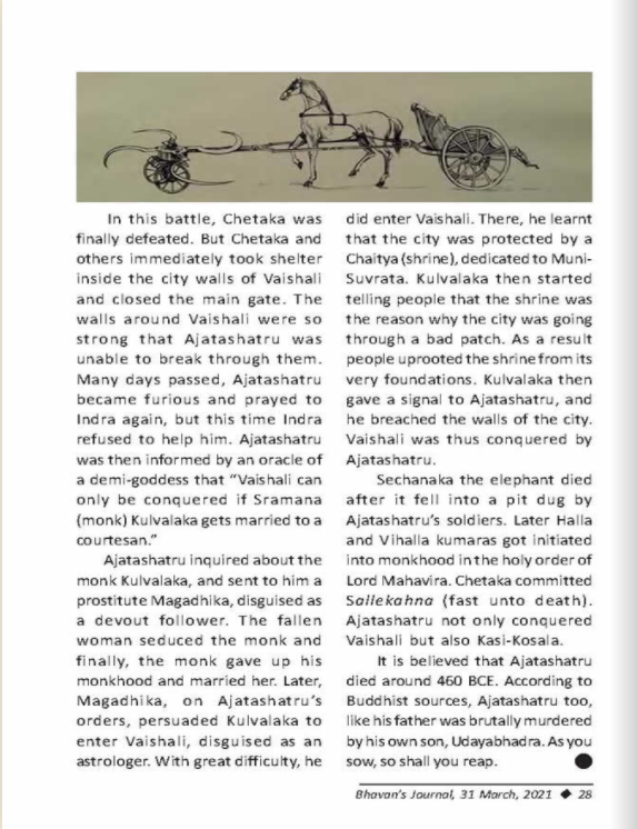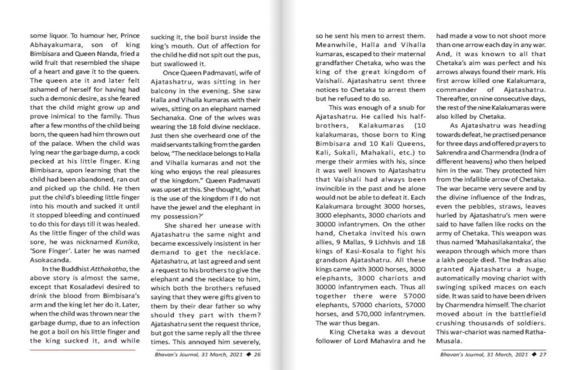 Short stories and Articles published in Bhavan’s Journal: Reality and Perception, 15.10.19; Sending the Wrong Message, 31.5.20; Eagle versus Scholars June, 15 & 20 2020; Indica, 15.8.20; The Story of King Chitraketu, August 31 2020; Breaking Through the Chakravyuh, September 30 2020. The Questioning Spouse, October 31, 2020; Happy Days, November 15, 2020; The Karma Cycle of Paddy and Wheat, December 15,2020; Power Vs Influence, January 31, 2021; Three Refugees, March 15, 2021; Rise and Fall of Ajatashatru, March 31, 2021;