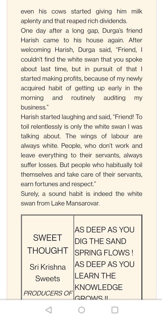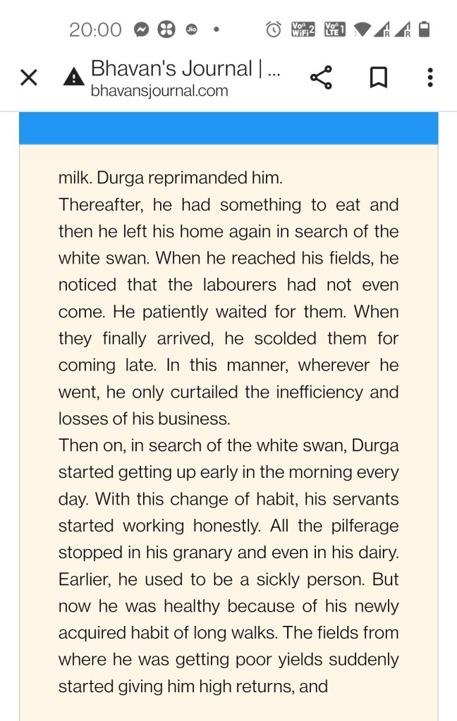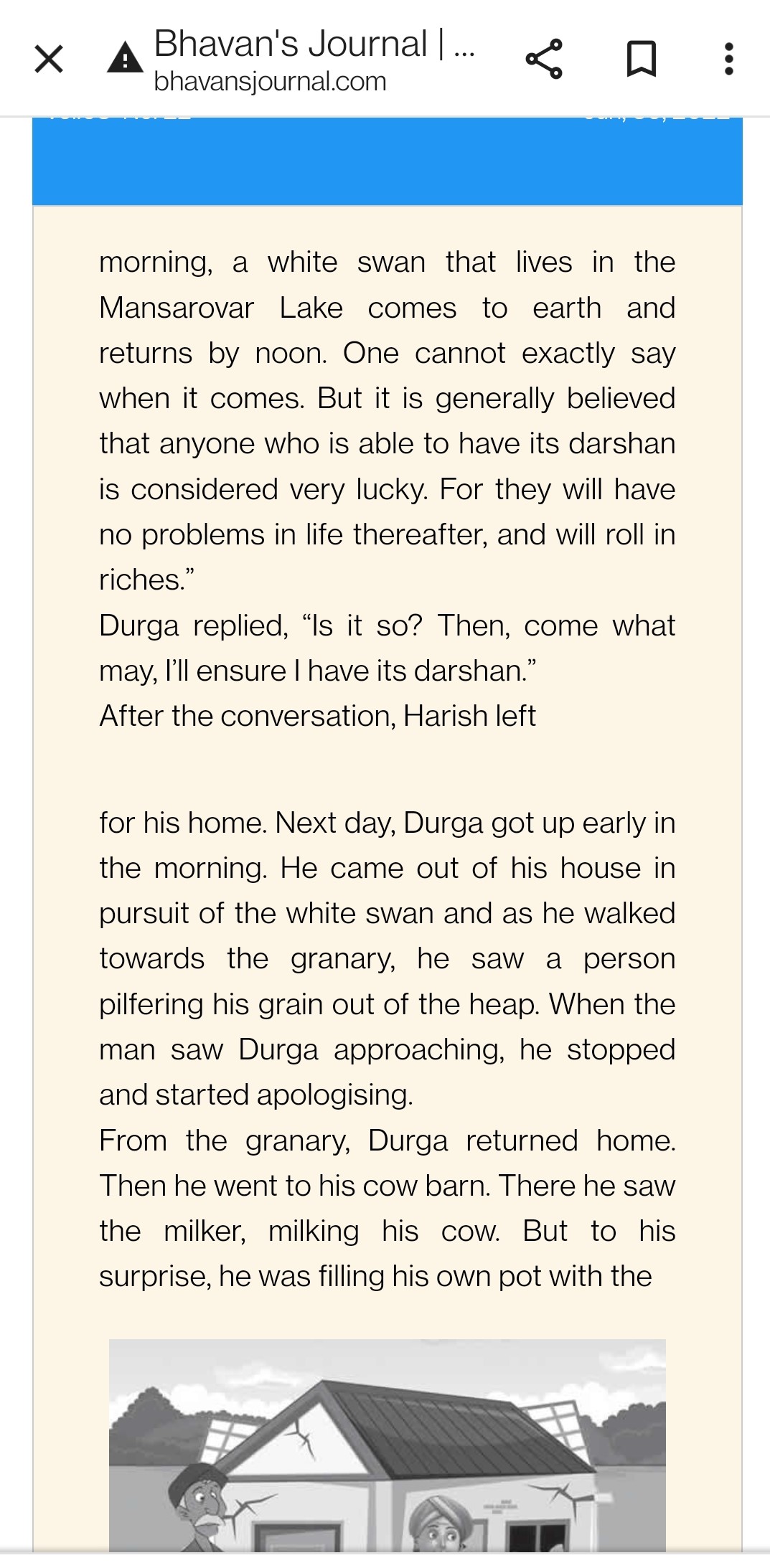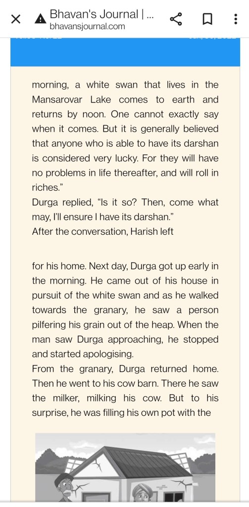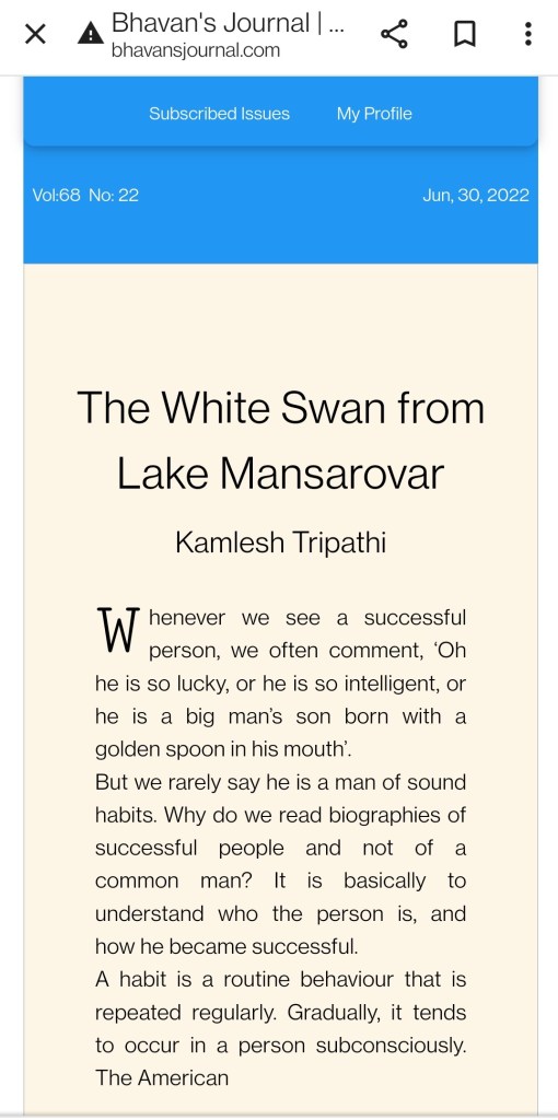 Short stories, Book reviews and Articles published in Bhavan’s Journal: 1.Reality and Perception, 15.10.19; 2.Sending the Wrong Message, 31.5.20; 3. Eagle versus Scholars June, 15 & 20 2020; 4. Indica, 15.8.20; 5. The Story of King Chitraketu, August 31 2020; 6. Breaking Through the Chakravyuh, September 30 2020. 7. The Questioning Spouse, October 31, 2020; 8. Happy Days, November 15, 2020; 9. The Karma Cycle of Paddy and Wheat, December 15, 2020; 10. Power Vs Influence, January 31, 2021; 11. Three Refugees, March 15, 2021; 12. Rise and Fall of Ajatashatru, March 31, 2021; 13. Reformed Ruler, May 15, 2021; 14. A Lasting Name, May 31, 2021; 15. Are Animals Better Teachers?, June 16, 2021; 16. Book Review: The Gram Swaraj, 1.7.21; 17. Right Age for Achievements, 15.7.21; 18. Big Things Have Small Beginnings, 15.8.21; 19. Where is Gangaridai?, 15.9.21; 20. Confront the Donkey Within You 30.9.21; 21. Know Your Strengths 15.10.21; 22. Poverty 15.11.21; 23. Top View 30.11.21; 24. The Bansuriwala 15.1.22; 25. Sale of Alaska 15.2.22; 26. The Dimasa Kingdom 28.2.22; 27. Buried Treasure 15.4.22; 28. The Kingdom of Pragjyotisha 30.4.22; 29. Who is more useful? 15.5.22; 30. The White Swan from Lake Mansarovar 30.6.22;