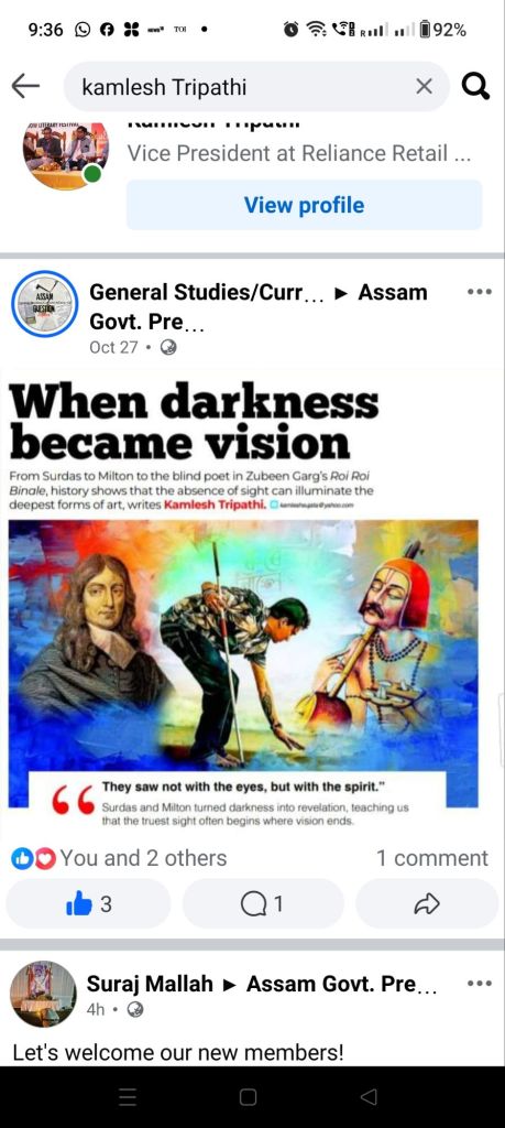 When Darkness became vision as published in The Assam Tribune