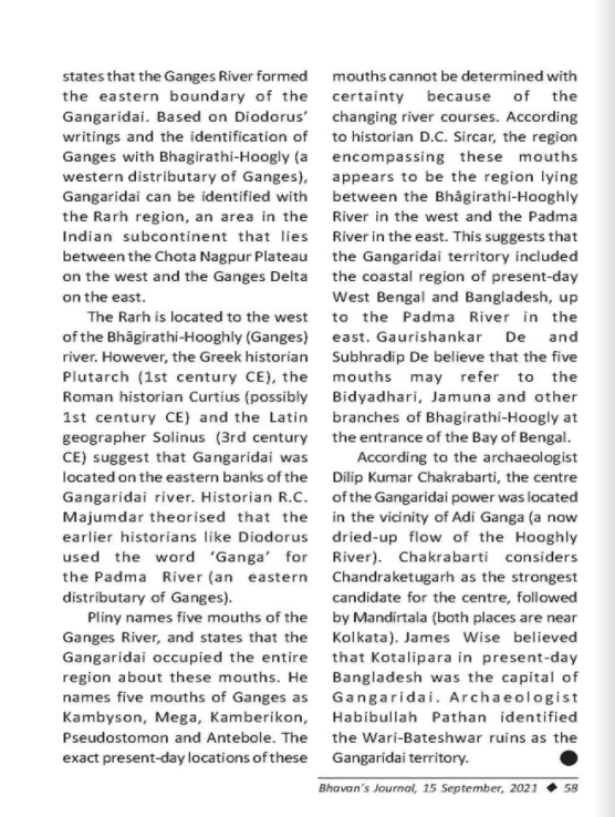Diodorus (1st century BCE) states that the Ganges River formed the eastern boundary of the Gangaridai. Based on Diodorus’s writings and the identification of Ganges with Bhagirathi-Hoogly (a western distributary of Ganges), Gangaridai can be identified with the Rarh region an area in the Indian subcontinent that lies between the Chota Nagpur Plateau on the West and the Ganges Delta on the East.
