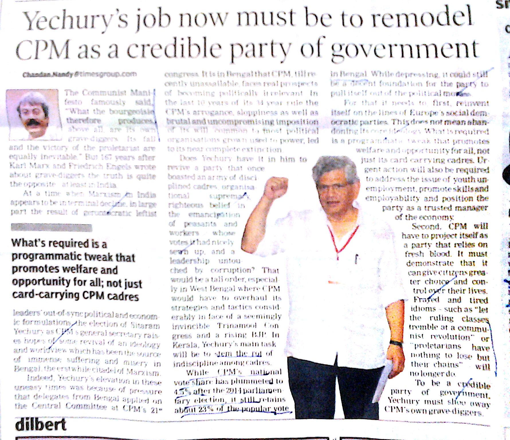 So, under the circumstances one feels CPM through Sitaram Yechury can revive the Party in a big way only if it can be a party with a difference. For let us understand no ideology is old and irrelevant for it recycles and comes back.  India is known for old wine in new bottle and we alone had a car with nine lives- Ambassdor, on the Indian roads even today. What is out of fashion today, will be the fashion tomorrow. And, let’s not forget the rich and mighty of India, once again have started behaving in a irresponsible manner and so a balancing factor is very much required.