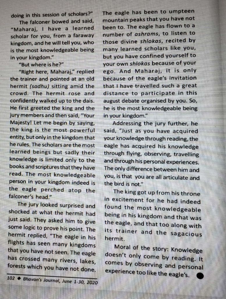 Short stories, Book reviews and Articles published in Bhavan’s Journal: 1. Reality and Perception, 15.10.19; 2. Sending the Wrong Message, 31.5.20; 3. Eagle versus Scholars June, 15 & 20, 2020; 4. Indica, 15.8.20; 5. The Story of King Chitraketu, August 31 2020; 6. Breaking Through the Chakravyuh, September 30 2020. 7. The Questioning Spouse, October 31, 2020; 8. Happy Days, November 15, 2020; 9. The Karma Cycle of Paddy and Wheat, December 15, 2020; 10. Power Vs Influence, January 31, 2021; 11. Three Refugees, March 15, 2021; 12. Rise and Fall of Ajatashatru, March 31, 2021; 13. Reformed Ruler, May 15, 2021; 14. A Lasting Name, May 31, 2021; 15. Are Animals Better Teachers? June 16, 2021; 16. Book Review: The Gram Swaraj, 1.7.21; 17. Right Age for Achievements, 15.7.21; 18. Big Things Have Small Beginnings, 15.8.21; 19. Where is Gangaridai?, 15.9.21; 20. Confront the Donkey Within You 30.9.21; 21. Know Your Strengths 15.10.21; 22. Poverty 15.11.21; 23. Top View 30.11.21; 24. The Bansuriwala 15.1.22; 25. Sale of Alaska 15.2.22; 26. The Dimasa Kingdom 28.2.22; 27. Buried Treasure 15.4.22; 28. The Kingdom of Pragjyotisha 30.4.22; 29. Who is more useful? 15.5.22; 30. The White Swan from Lake Mansarovar 30.6.22; 31. Bhool Bhulayya 15.9.22; 32. Good Karma 30.9.22; 33. Good Name vs Bad Name 15.10.22; 34. Uttarapath—The Grand Trunk Road 1.12.22; 35. When Gods Get Angry 1.1.23; 36. Holinshed’s Chronicles 15.1.23; 37. Theogony 15.2.23; 38. Poem: Mother 14.5.23; 39. THE NAG MANDIR 30.6.23; 40. The Story of Garuda 30.7.23; 41. Janmabhoomi vs Karmabhoomi 31.8.23; 42. The Ghost Town of Kuldhara 15.9.23; 43. The Tale of Genji 15.10.23;