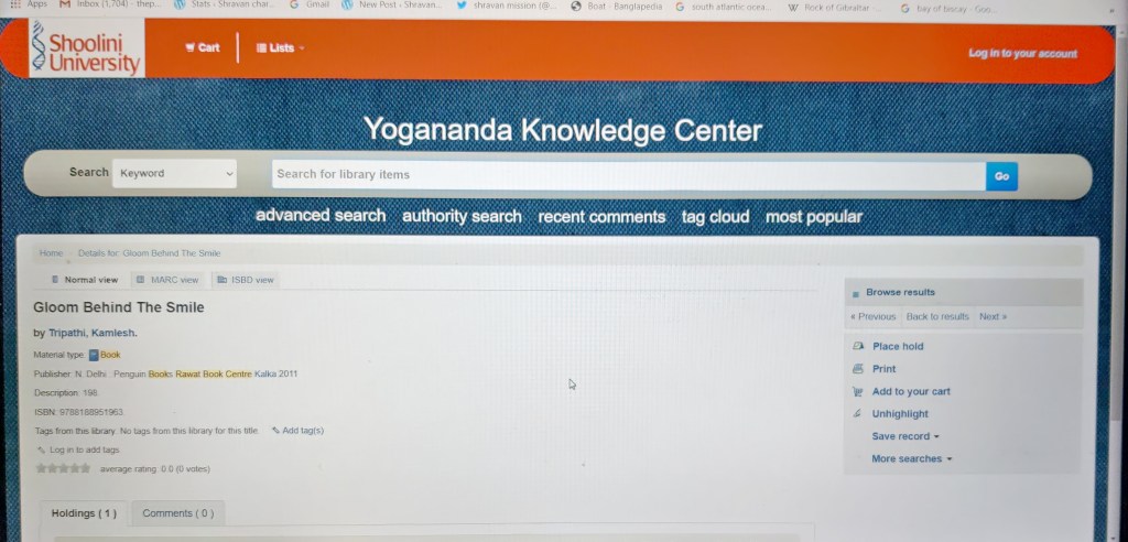 (The book is about a young cancer patient. Now archived in 8 prestigious libraries of the US which include Harvard College Library; Harvard University Library; Library of Congress; University of Washington, Seattle; University of Minnesota, Minneapolis; Yale University, New Haven; University of Chicago; University of North Carolina, at Chapel Hill University Libraries. It can also be accessed at MIT through Worldcat.org. Besides, it is also available for reading in libraries and archives of Canada; Cancer Aid and Research Foundation Mumbai; Jaipuria Institute of Management, Noida, India; Shoolini University, Yogananda Knowledge Center, Himachal Pradesh and Azim Premzi University, Bangalore).