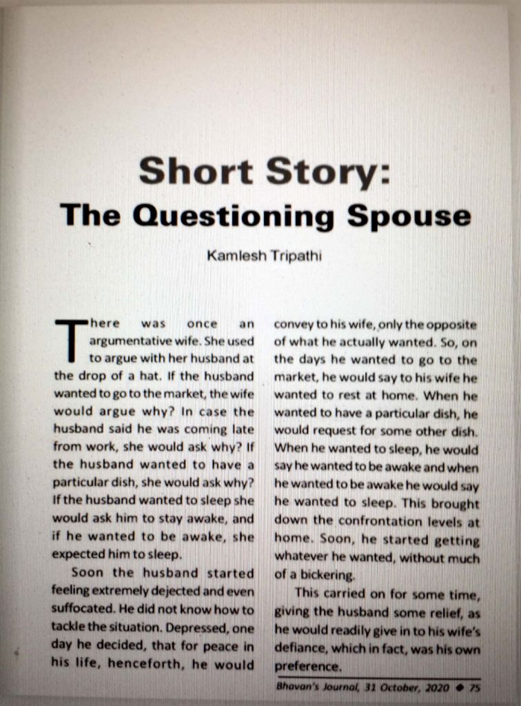 Short stories and Articles published in Bhavan’s Journal: Reality and Perception, 15.10.19; Sending the Wrong Message, 31.5.20; Eagle versus Scholars June, 15 & 20 2020; Indica, 15.8.20; The Story of King Chitraketu, August 31 2020; Breaking Through the Chakravyuh, September 30 2020. The Questioning Spouse, October 31, 2020;
