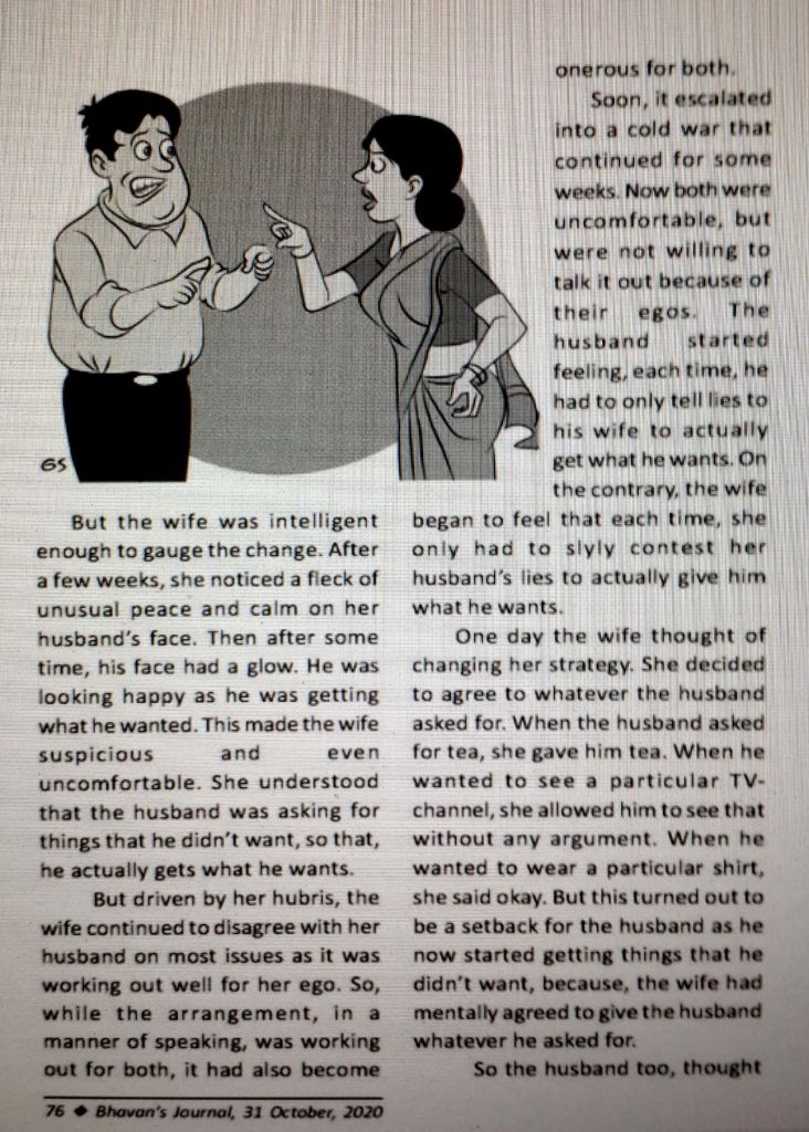 Soon the husband started feeling extremely dejected and even suffocated. He did not know how to tackle the situation. Depressed, one day he decided, that for peace in his life, henceforth, he would convey to his wife, only the opposite of what he actually wanted. So, on the days he wanted to go to the market, he would say to his wife he wanted to rest at home. When he wanted to have a particular dish, he would request for some other dish. When he wanted to sleep he would express he wanted to be awake and when he wanted to be awake he would express he wanted to sleep. This brought down the confrontation levels at home. Soon, he started getting whatever he wanted without much of a bickering.
