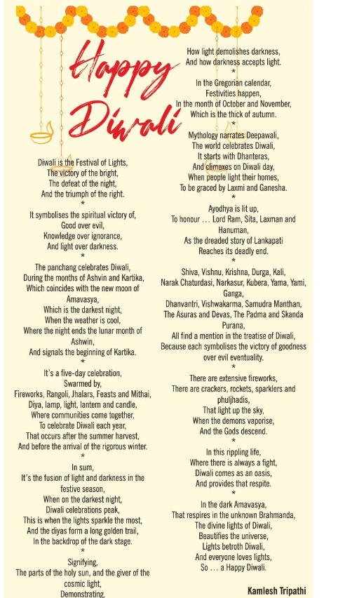 Articles & Poems: 1. Poem: Happy New Year 8.1.23; 2.Poem: Spring 12.3.23; 3.Poem: Right and Wrong 20.3.23; 4. The Gush of Emotion—Writing, 26.3.23; 5. The Nag Mandir, 7.5.23; 6. Poem: Mother 7.5.23; 7. Poem: Rain Rain 9.7.23; 8. Poem: You Come Alone You Go Alone 6.8.23; 9. Poem: Rain Rain (Second Time) 10.8.23; 10. Poem: Guru Teacher 1.10.23; 11. Poem: Autumn … The Interim Heaven 15.10.23; 12. Poem: Happy Diwali 12.11.23; 13. Overcoming Blindness: Learn it the John Milton Way 10.12.23; 14. The Happy Prince and The Happy Man’s Shirt 31.12.23; 15. Annus Mirabilis -2024 7.1.24; 16. Gandhi to Mahatma Gandhi- Incidents that Shaped Gandhi in South Africa 28.1.24; 17. Poem: Together But Not Made For Each Other, 11.2.24; 18. The Birds Bees and The Spiders of Nicholas Guildford and Jonathan Swift 25.2.24; 19. The Overcoats of Nikolai Gogol and Ruskin Bond 10.3.24; 20. The Ethnic Colours of Holi 24.3.24; 21. A Lesson from Dalai Lama, 21.4.24; 22. Poem: Morning Walk 28.4.24; 23. Trip to Rhine Falls, Switzerland, 19.5.24; 24. Poem: Hurt 2.6.24; 25. Poem: Your Conscience Was My Sign On 16.6.24; 26.Poem: The Eerie Ways of Time 7.7.24; 27.Poem: Celebrating the T20 World Champions 14.7.24;28. Read to Rise above mediocrity, 4.8.24; 29. Poem: Desire vs Reality 11.8.24; 30. Jack Ma’s Pristine Advice to Employers, Employees and the Youth 22.9.24; 31. Tagore and Kipling 3.11.24; 32. Poem: Merry Christmas 22.12.24; 33. Poem: The Sunset Point, 5.1.25; 34. Cancer Warning Labels on Alcoholic Beverages, 12.1.25; 35. Poem: Hope … In the Arc of Twilight, 19.1.25;
