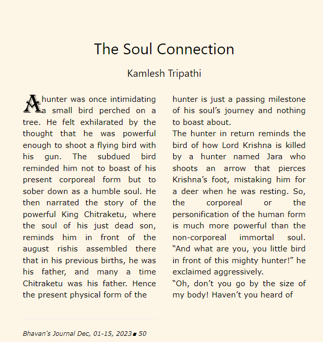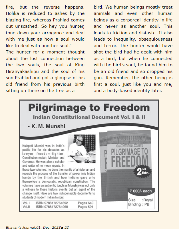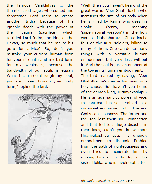 Short stories, Book reviews and Articles published in Bhavan’s Journal: 1. Reality and Perception, 15.10.19; 2. Sending the Wrong Message, 31.5.20; 3.Eagle versus Scholars June, 15 & 20, 2020; 4.Indica, 15.8.20; 5.The Story of King Chitraketu, August 31 2020; 6.Breaking Through the Chakravyuh, September 30 2020. 7. The Questioning Spouse, October 31, 2020; 8. Happy Days, November 15, 2020; 9.The Karma Cycle of Paddy and Wheat, December 15, 2020; 10.Power Vs Influence, January 31, 2021; 11.Three Refugees, March 15, 2021; 12.Rise and Fall of Ajatashatru, March 31, 2021; 13.Reformed Ruler, May 15, 2021; 14.A Lasting Name, May 31, 2021; 15.Are Animals Better Teachers? June 16, 2021; 16.Book Review: The Gram Swaraj, 1.7.21; 17.Right Age for Achievements, 15.7.21; 18.Big Things Have Small Beginnings, 15.8.21; 19.Where is Gangaridai?, 15.9.21; 20.Confront the Donkey Within You 30.9.21; 21. Know Your Strengths 15.10.21; 22. Poverty 15.11.21; 23. Top View 30.11.21; 24. The Bansuriwala 15.1.22; 25.Sale of Alaska 15.2.22; 26.The Dimasa Kingdom 28.2.22; 27. Buried Treasure 15.4.22; 28. The Kingdom of Pragjyotisha 30.4.22; 29.Who is more useful? 15.5.22; 30. The White Swan from Lake Mansarovar 30.6.22; 31. Bhool Bhulayya 15.9.22; 32. Good Karma 30.9.22; 33. Good Name vs Bad Name 15.10.22; 34.Uttarapath—The Grand Trunk Road 1.12.22; 35.When Gods Get Angry 1.1.23; 36. Holinshed’s Chronicles 15.1.23; 37. Theogony 15.2.23; 38. Poem: Mother 14.5.23; 39. THE NAG MANDIR 30.6.23; 40. The Story of Garuda 30.7.23; 41. Janmabhoomi vs Karmabhoomi 31.8.23; 42. The Ghost Town of Kuldhara 15.9.23; 43. The Tale of Genji 15.10.23; 44. The Soul Connection 1.12.23;